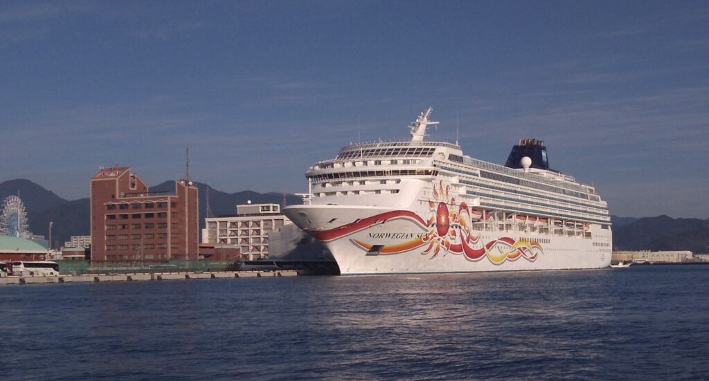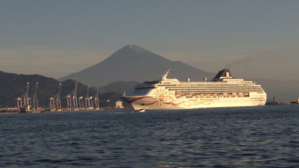 今朝はさらに大型客船🛳️ノルウェージャン・サン号が入港するところに出会しました。