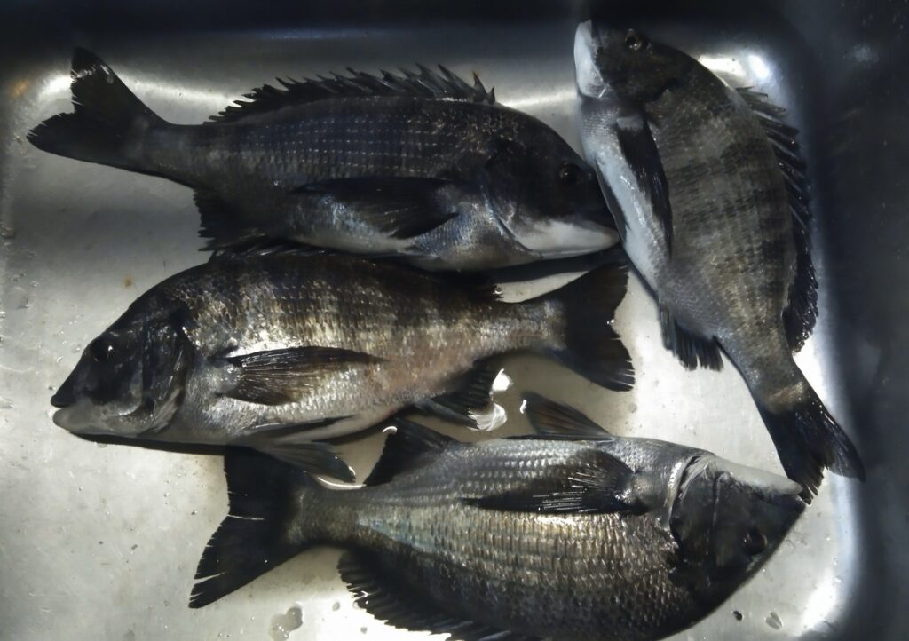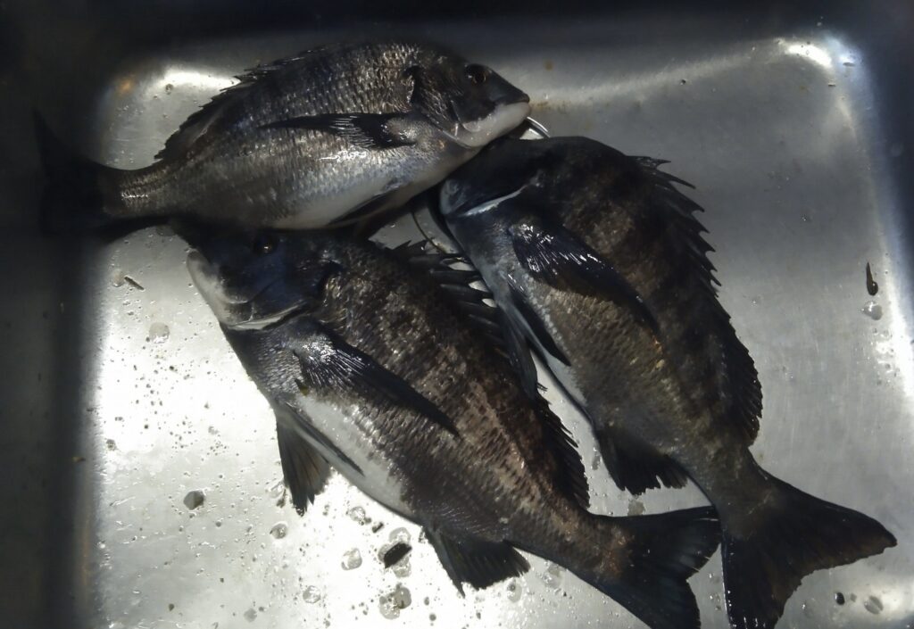 午前中は当たりが乏しく、クロダイをゲットしていたのは二ヶ所のみ。